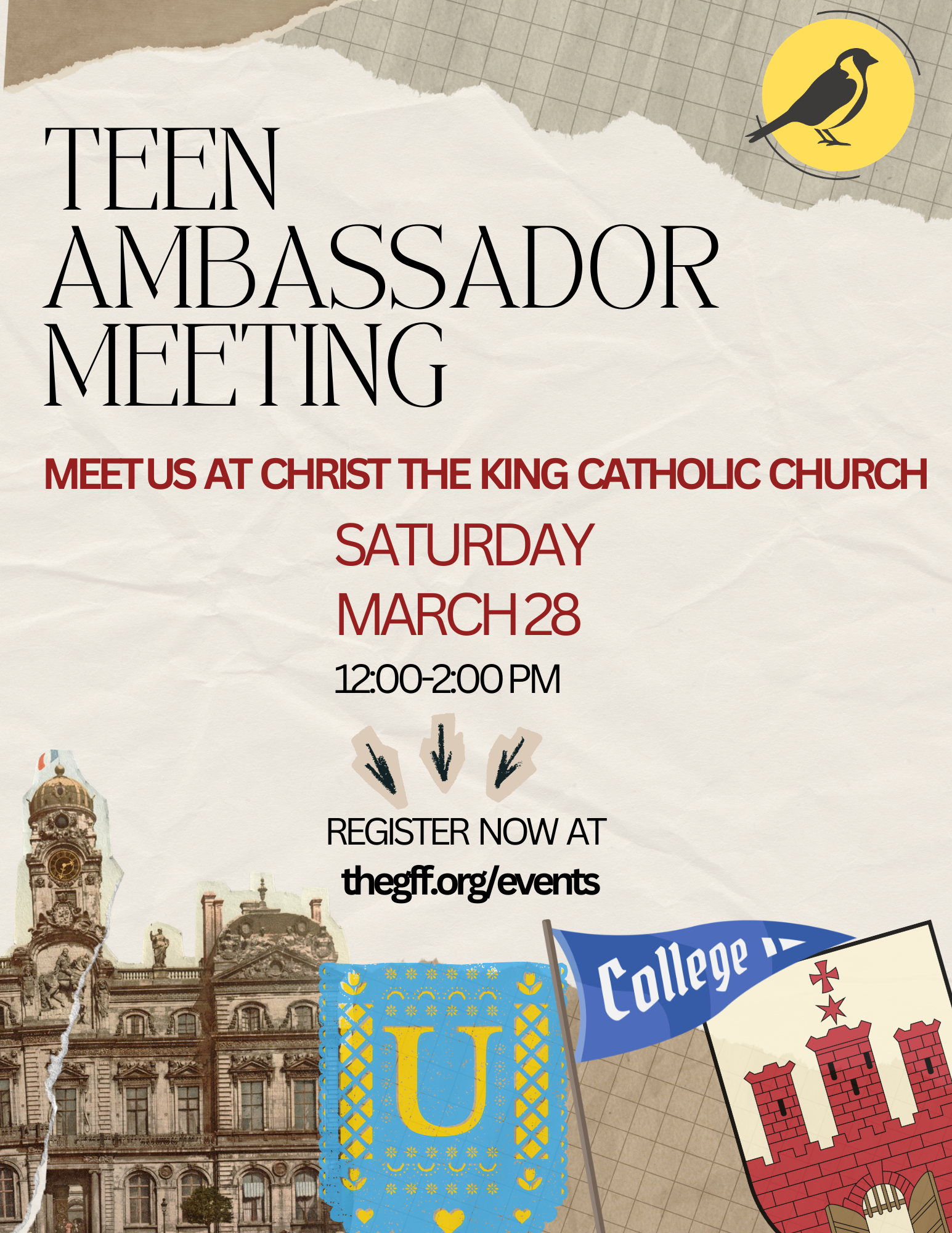 GFF Teen Ambassador meeting Saturday, March 28, 2026 12:00 PM 2:00 PM Christ the King 3001 Belmont Boulevard Nashville, TN, 37212 United States (map) Google Calendar ICS