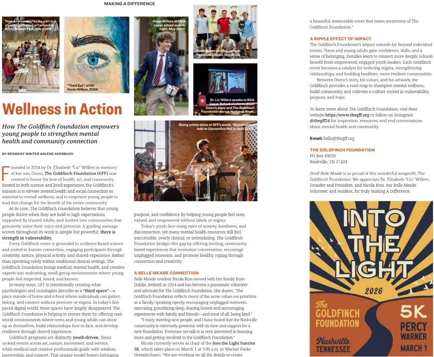 The Goldfinch Foundation truly appreciates Stroll Belle Meade magazine for their February article highlighting our foundation and the ways we empower young people to strengthen mental health and foster meaningful community connection.